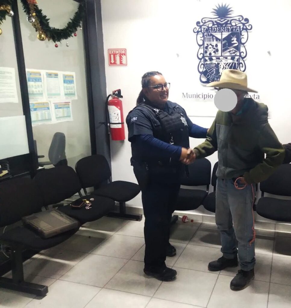 En un emotivo reencuentro, un adulto mayor extraviado fue localizado y entregado a sus familiares gracias a la rápida y efectiva coordinación entre la Secretaría de Seguridad y Protección Ciudadana de Colón y Secretaría de Seguridad Pública de Cadereyta.